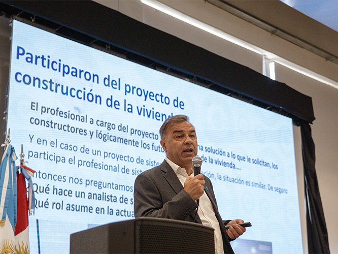 El profesor Augusto Herrera tuvo a su cargo la primera disertación en el auditorio mayor, titulada "Años atrás, tecnologías emergentes; hoy, una realidad", donde analizó la historia y el impacto de las nuevas herramientas digitales que ya forman parte de la vida cotidiana y del aula.